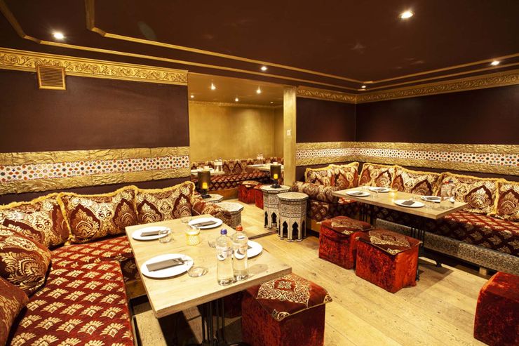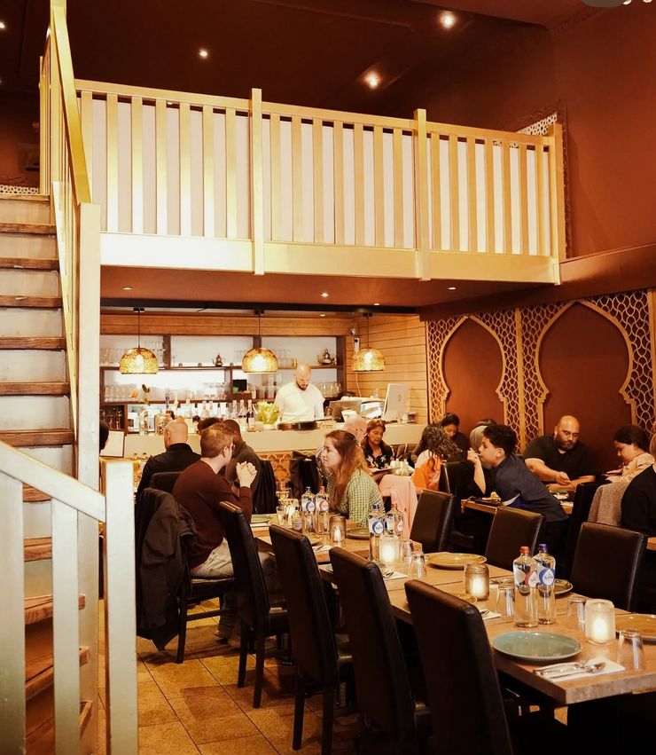 Het restaurant heeft een warme, uitnodigende ambiance met een sfeervolle benedenruimte en een intieme Arabisch geïnspireerde zithoek op de bovenverdieping. Parkeren kan in de nabijgelegen garages of op straat, openbaar vervoer is uitstekend.