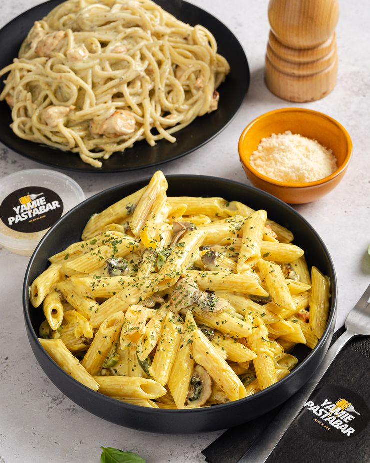 Yamie Pastabar Almere biedt een uitgebreide menukaart met pastagerechten in uiteenlopende smaken. Je kunt kiezen uit bekende klassiekers zoals bolognese en carbonara, maar ook uit romige pasta’s met truffel of pesto. Daarnaast zijn er pasta’s met kip, vis of scampi en diverse vegetarische opties. Wie liever zelf samenstelt, kan een pasta combineren met een saus en ingrediënten naar keuze. Extra’s zoals kruidenstokbrood, Parmezaanse kaas of mozzarella maken de maaltijd compleet, met desserts zoals tiramisu of cheesecake als smakelijke afsluiter.